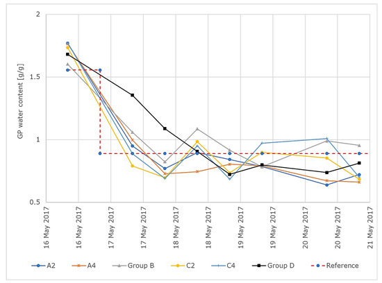 The gravimetric GP water content over time for all groups and for a reference variable of 0.89 g/g is shown in Figure 10.