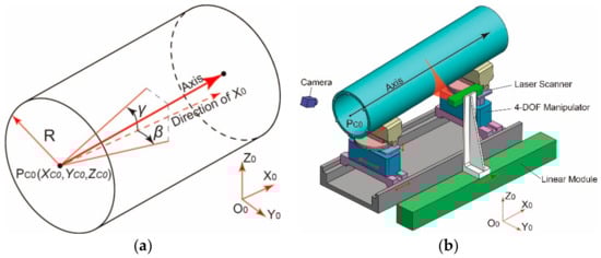 The measurement-adjustment system is illustrated in Figure 1. As shown in Figure 1a, a 6-dimensional vector is adopted to describe the pose of the cylindrical part, where is coordinate of the center of end surface , is the rotation angle about the axis, , are the projection angles of the axis to the coordinate plane and , i.e., deflection angle and pitch angle .