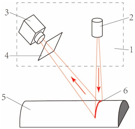 Diagram of a typical laser scanning sensor: 1. Laser scanning sensor; 2. Laser projector; 3. Camera; 4. Imaging Plane; 5. Part to be measured; 6. Laser strip.