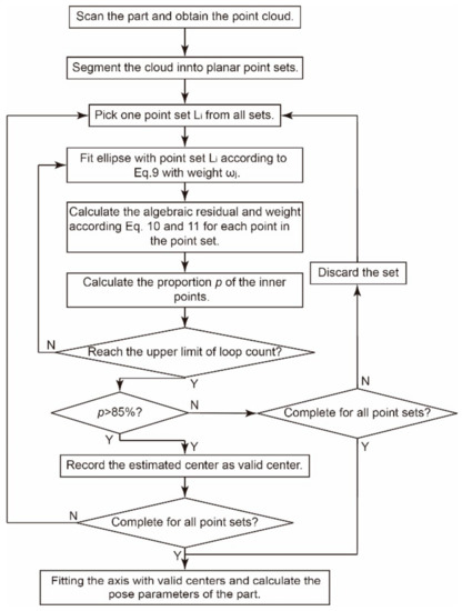However, the surface of the object is not always an ideal cylindrical surface in actual engineering. This fact will introduce an adverse effect on the least square fitting of the ellipse centers. The causes of this problem are various, for example, the geometric interface features such as holes and bulges, the specular reflection of the laser, the occlusion of the fixture and the measurement noise, etc. Therefore, the above approaches are far from enough to get the pose parameters precisely, corresponding robust enhancements must be adopted to improve the reliability of the system. According to this demand, commonly used approaches involve M-estimation [25], least square median filtering [26], and random sampling consistency (RANSAC) [27]. For the robust fitting problem of the ellipse, Halir et al. [25] proposed an estimation method based on M-estimation, which can obtain the ellipse center more accurately in the case of external point interference. However, one disadvantage is that the algorithm may fail when the amount of external points is large. For RANSAC, Chen et al. [28] identified obscured pupils by RANSAC, through which the correct position of the pupil center can be obtained with a high probability, but the calculation efficiency is relatively low. In general, the M-estimation always has a smaller computing load and RANSAC approach has stronger robustness. Thus, we improve the M-estimation to valid the profile sets and eliminate the invalid sets.