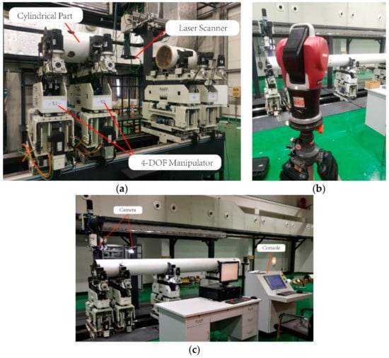 As shown in Figure 8a, a commercial Gocator 2350 laser scanner manufactured by the LMI Technology based on the line structured light triangulation is mounted on a linear module which can drive the sensor scan the parts on the two assembly manipulators. A laser tracker system (LTS), shown in Figure 8b, is employed as a comparison.