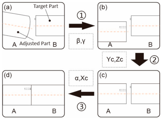Considering the error accumulation in the motion process of the mechanism, the measurement-adjustment process shown in Figure 9 is divided into the following three steps.