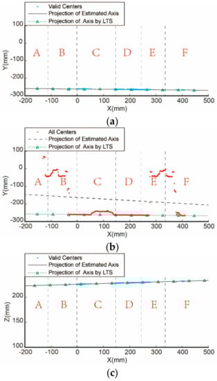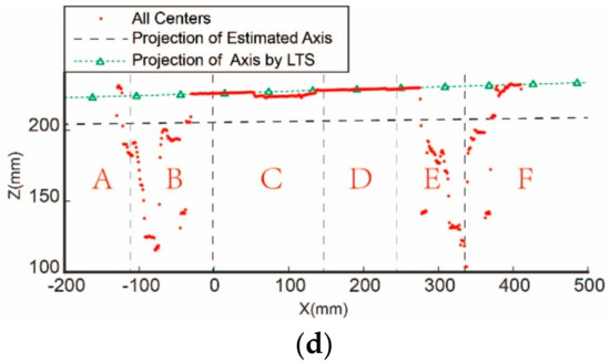 The results in Figure 10 are quantified in Table 3. It can be concluded that in the case of interference, the non-robust method cannot get the correct result because it is not able to eliminate the interferences. The invalid profiles are discarded by the proposed robust method. The results show that the measured angle deviation between the prototype and the LTS is less than 0.02°, the position deviation of the axis is less than 0.3 mm. That is to say, the robust method proposed in this paper is proven to be effective from the engineering point of view.