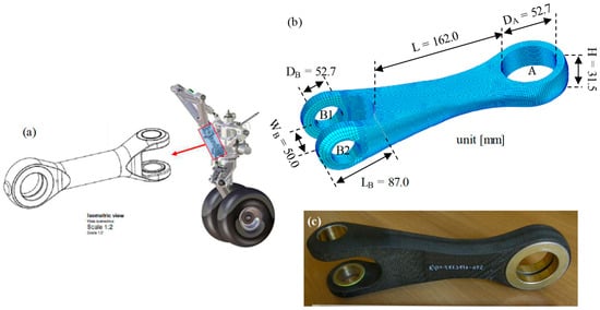 (a) Schematic view of the landing gear (LG) and standard drag brace; and (b) design and (c) picture of the composite drag brace.