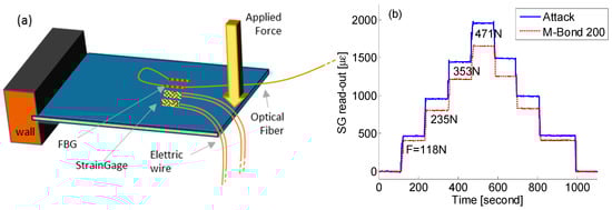 (a) Schematic view of the sensorized composite panel test; and (b) strain reading of two strain gauges (SGs) fixed by means of Attack and M-Bond 200 adhesive, respectively, for different load states.