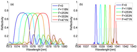 Fiber Bragg Grating (FBG) spectra in different strain states: (a) a 1.0 mm long FBG; and (b) a 10.0 mm long FBG.
