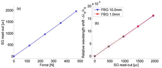 (a) Surface strain (from electrical SG) vs. applied force; and (b) relative wavelength shifts of FBGs vs. surface strain.