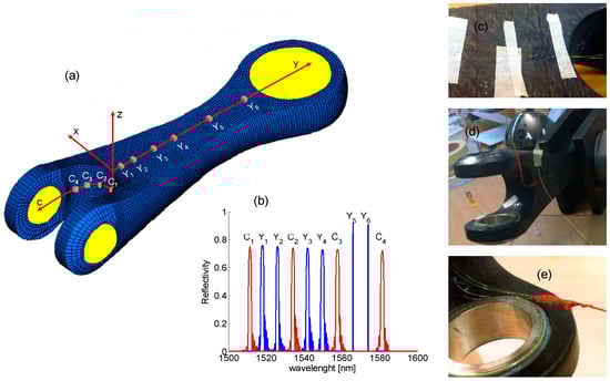 All sensors were glued by means of the procedure discussed in previous section and consisted of unpackaged FBGs with 20 µm thick polyamide coating. Moreover, most of the sensors were based on 1.0 mm long FBGs, in order to decrease the sensing area. Only the sensors Y5 and Y6 were selected to be 10.0 mm long because they are expected to be fixed in a region with low strain variation, as from numerical results. Figure 6b plots the spectra of all FBG sensors: Y-array and C-array. All sensors 1.0 mm long exhibited a FWHM (Full Width at Half Maximum) bandwidth of about 1.6 nm whereas the 10.0 mm long gratings showed a bandwidth of about 0.2 nm. Figure 6c–e shows some pictures during the gluing of sensors. Moreover, the fiber coming out from the composite item was then protected by a red silicone glue.