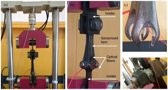 Finally, the loading test was carried out by means of an appropriate press machine for high load condition provided from a Magnaghi co-worker. The Figure 7a,b shows pictures of the sensorized item fixed in the load-machine by means of two proper metallic holders (upper and lower ones). The load-machine was programmed to apply an incremental traction with a rate of 250 N/s.