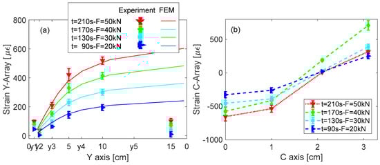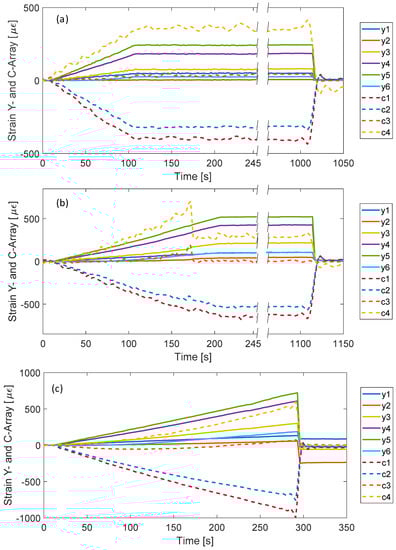Figure 8a plots the strain values returned from the Y-array and C-array, versus acquisition time during the first test section, named test A. The applied force starts from zero (at 10 s) and reaches the maximum load of 25 kN at 110 s. During the incremental load ramp, as expected, all sensors of Y-array explore positive longitudinal strain/traction. In particular, the measured strain increases moving from Y1 to Y5, accordingly with numeric results and with the decreasing of the cross-section area of the composite item. On the contrary, the strain measured from Y6 is significantly lower than Y5 one. It can be attributed to the further increase of the item cross section (as moving from the Y5 section to the Y6 section) and to the proximity to the metallic ferule of the upper fixing point.
