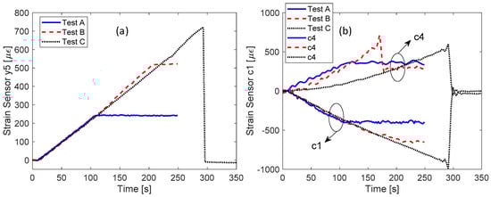 A better comparison between different load tests was conducted in the Figure 9a,b for sensor Y5 and for sensors C1 and C4, respectively. The response of sensors Y5 and C1 in different test ramps show a very good agreement. With reference to sensor Y5, the maximum difference occurs between test B and test C curves at 210 s and is less than 5%. Differently, the sensor C4 clearly demonstrated that its behavior during the load test is completely modified by the event during test B, confirming the hypothesis of partial breaking.