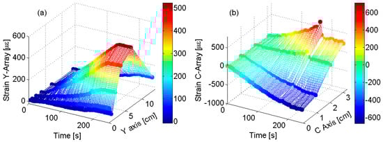 In order to demonstrate the capability of FBG sensors technology to be used as real-time tool for structural health monitoring of composite items in aeronautic applications, Figure 10a,b plots 3D real-time maps vs. y-axis and c-axis, respectively. The map images give a clear understanding of the complexity of the investigated surface in terms of the strain value and of the rate of changes along the spatial axis (y- and c-axis). Also, the Figure 10b clearly shows the capability to identify the anomalous situation occurs at 170 s and thus shows the capability to act as an early warning monitoring system.