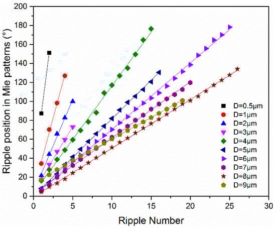 The relationship between particle size D and the ripple width have been discussed by some researchers [32,37]. According to C.M. Sorensen’s results [30], for the particle with a large phase shift parameter , the ripple width can be experientially summarized as . It should be noted that the angles used in this paper are reported in degrees, while C.M. Sorensen reported radians. For the particles discussed in this paper, the refraction index m is 1.54, and for particles greater than ~1 μm in size, the phase shift parameter is greater than five. To preserve a similar law with the former experiential relationships between ripple width and particle size, a power law fit is explored, and the best fit is . Regarding this fitting, the particle size is extended to 0.5 μm, which can also see 1 ripple from the scattering distributions. Figure 3 presents the fitting curve of the relationship between ripple width and particle size. The small difference in the exponent compared with the former experiential formula can be attributed to the lack of rigorous physical interpretation and some approximate conditions in the former studies. Moreover, the accurate calculation results from Mie theory in Figure 1 suggested that the ripple width is not exactly constant even though deviation is small and we used the average ripple width here. These findings prove that the experiential formula is not absolutely accurate for all conditions. Thus, to obtain accurate results in this study, we used the best-fit parameter to establish the relationship between the average ripple width and particle size. The conversion formula is defined as the following Equation (5):