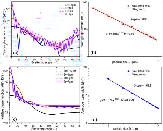 The relative phase function I(θ)/I(45°) with different particle size and the relationship between average ripple width and the particle size are shown in the left and right panels, respectively, for (a,b) polystyrene particles and (c,d) coal dust.