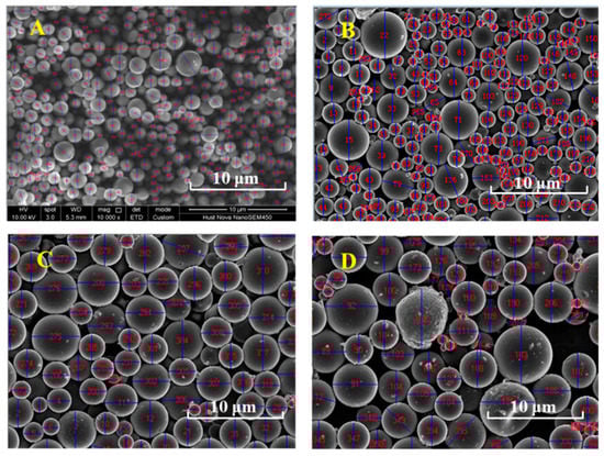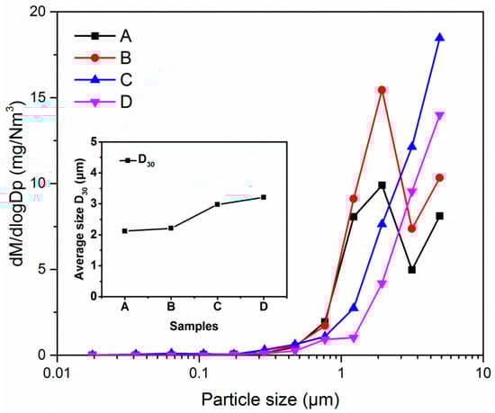 To test the measurement of particle size by the ripple width; and verify the contribution of the simultaneously measured particle size on the mass concentration, four quartz particles A, B, C, and D with different sizes were chosen as the aerosol samples. Figure 7 presents the scanning electron micrograph (SEM) of the four samples. These particles are approximately spherical to eliminate the effect of particle shape. In addition, the emitted micron-sized and submicron-sized particles after the dust-removing equipment in coal-fired power plants are mostly spherical because they are mostly formed by the mechanism of volatilization and condensation. The reference instrument ELPI measured the particle size distribution and calculated the medium diameter of the particle size, which can be seen in Figure 8. Of note, the aerodynamic sizes of ELPI have been converted to geometric diameter according to the formula in reference [44], and all the diameters in this paper are geometric diameters, which is convenient for optical measurement and calculation. The results indicate that the mass medium diameters of aerosols A, B, C, and D are 2.02 μm, 2.03 μm, 2.62 μm, and 2.63 μm, respectively; however, the dispersion index is slightly different.