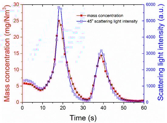 To verify the aerosol mass concentration measurement availability of the experimental setup, the real-time records of mass concentration measured by ELPI is compared with the scattering intensity measured from the fixed 45° detector. For example, Figure 9 represents the simultaneous readings of the two devices for aerosol B within 1 min. The real-time mass concentration of the aerosol measured by ELPI is thought to be accurate and used as a reference for the light scattering method. According to Maricq’s results [45], the mass concentration error measured by ELPI is within 20%. The mass concentration is in the range of 0 to 30 mg/Nm3 (milligram per cubic meter at the standard condition) and changes quickly with time, which is consistent with the emission conditions of particulate matter in industrial environments, such as power plants. These results indicate the effectiveness of the generated aerosol concentration. In addition, the transmission of the light should be greater than 60% if multiple scattering does not occur. The transmission of the light can be calculated by Equation (9) [19]. Table 2 presents the particle concentration of nine size bins greater than 0.1 μm for sample A as measured by ELPI. When the length of the optical path L = 0.005 m, Cext is the extinction cross-section, a function of particle size D and refractive index m = 1.54 as calculated with the Mie theory, and n(D) is the particle number distribution as noted in Table 2. Here we ignore the minimal contribution of the particles less than 0.1 μm. The calculation result of the transmission is It/I0 = 99.997%, which indicates that only single scattering occurs in the experiments.