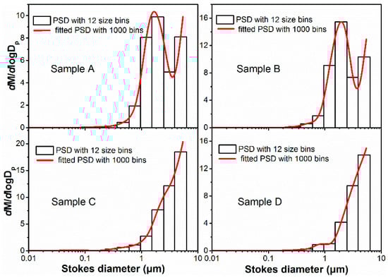 The particle size distributions (PSDs) of the four aerosol samples (A–D). (The histograms represent the measurements of the instruments with 12 size bins, and the curves represent the interpolating fitting with 1000 size bins).