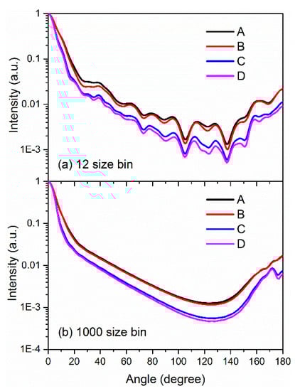 Natural particles are mostly polydisperse and not monodisperse. Thus, the application of the particle size indication by scattering ripple width should be verified under at least moderately polydisperse particles. Figure 10 presents the particle size distributions in the experiment with different particle numbers. In Figure 10, the histograms are the ELPI measurement results with 12 size bins that represent the discontinuous of particle size distributions when the particle amount is small. The red curves represent the interpolating fitting with 1000 size bins, and the same distributions are noted with ELPI measurements. These curves represent continuous particle size distributions when the particle number is large. Given these different size distributions, the angular distributions of the scattering light of the four samples can be calculated with Equation (2). Figure 11a,b represents the simulated scattering light distributions with different particle numbers of 12 size bins and 1000 size bins for the four aerosol samples. When the particle size distribution ranged from 0.01 to 10 μm and is separated by 12 bins, obvious scattering ripples can be observed for all the four samples. When the particle number increases, and the size bins can increase to 1000, the particle size distributions are finely divided by every 0.01 μm. In addition, the calculated scattering light distributions become smooth, and the ripples disappear. Our further calculations indicate that the ripples are strongly dependent on the continuity of particle size, and the visibility of the ripples reduces with the increase of segments of the particle size distributions (PSDs) to the polydisperse particles, such as the common log-normal and Rosen–Rammler distributions. This finding is attributed to the fact that the successive sized particles have similar ripple patterns but a slight shift. When the size of the aerosol has sufficient continuity, the waning and waxing intensity of scattered light for the particles with adjacent size can wash out the ripples of the scattered light distribution for particles with a disperse PSD, leaving only the broad outline of the patterns [30]. As a result, natural aerosols, which have continuous size distributions, typically exhibit obscure scattering ripples.