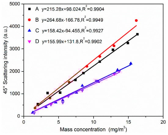 The data collected by the 45° fixed detector is correlated to the ELPI mass concentration to indicate the mass concentrations of particulate matter. As noted in former studies [56,57], the scattering light intensity is generally proportional to the mass concentration for a fixed diameter. Thus, the 45° scattering light intensity was linearly fitted with the ELPI mass concentration. Figure 13 presents the correlation of the scattering intensity with the mass concentration and the fitting lines. The parameters in the fitting formula are presented in Figure 13 and all the correlation coefficients R2 are greater than 0.99. Then the mass concentration can be calculated from the scattering light intensity according to Equation (8). The relationship of the scattering light intensity with the mass concentration for the aerosol A is , which means that the real-time mass concentration Cm can be retrieved by . The intercept −0.46 suggests that the zero drift of the mass concentration by light scattering method in this setup is lower than 1 mg/Nm3. The slopes are similar for couples (A, B) and (C, D), which is consistent with particle size in Figure 8 given that the particle sizes are similar for (A, B) and (C, D). This result indicates that the concentration transform factor K of this method is strongly affected by particle size. For example, the concentration transform factor K changed from 3.78 × 10−3 for particle A to 6.31 × 10−3 for particle C, and the mass medium particle size measured by ELPI changes from 2.03 μm to 2.62 μm, accordingly. To further characterize the measurement error, the error of particulate matter mass concentration is described by the standard residual error of the linear regression analysis according to the following Equation (10). Here, N is the number of the fitting points, and Cm,t is the predicted concentration according to Equation (8). Then the standard error ∆r of mass concentration of the four samples calculated by Equation (10) are 0.53 mg/Nm3, 0.40 mg/Nm3, 0.43 mg/Nm3, and 2.00 mg/Nm3 for A, B, C, and D, respectively.