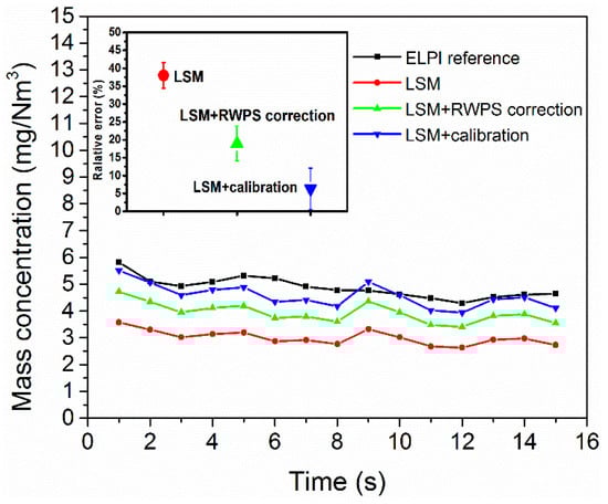 According to the measured concentration of the four samples, the mass concentration measurement based on the light scattering method is affected by particle size. Therefore, the simultaneous measurement of particle size would be necessary to ensure the real-time accuracy of the concentration. As shown in Section 4.2, the particle size can be roughly measured in real-time within minutes using the ripple width method. The instantaneous nature of the particle size reading depends on the rotation period of the rotating detector, which provides an average ripple width and further particle size during one period. To show the correction of the ripple width particle size to the real-time particle concentration measurement, it was assumed that the aerosol size changed from B to C. According to the light scattering method (LSM), the relation between mass concentration and scattering light is reported as the relation of aerosol B, . Given that the light scattering method modified by the ripple width particle size (LSM+RWPS), the measured average particle size changed from 1.84 μm to 2.36 μm. To obtain more accurate correction, the aerosol size distribution is assumed to be the Rosin–Rammler distribution [58]. The dispersion index is set as 4.0, which matches best with the distribution measured from ELPI and the SEM images. Thus, the cumulative mass distribution can be described as . Taking this information into consideration, the concentration transforming factor K can be calculated by Equation (6), and the result shows that KC/KB = 1.39. Thus, given the ripple width particle size, the relation has been amended as . The standard error ∆r of the measured mass concentration is 0.56 mg/Nm3 according to Equation (10). Based on these formulas, the real-time light intensity can be transformed into mass concentrations. Figure 14 presents the real-time mass concentrations of ELPI and the transform solutions. The LSM exhibits a large deviation from the reference measurement ELPI, which demonstrates that the concentration is inaccurate with the change of particle size, but with the correction from the ripple width particle size, the measurement deviation reduced obviously. The measurement error can be reduced from 38% to 18% with the real-time particle size measurement. And the results also indicate the measurement error of the light scattering method calibrated with known particles is ~6%, but it needs regular calibration, which is difficult for real-time calibration when particle size changes frequently. Thus, using the real-time ripple with particle size correction can effectively reduce the particulate matter mass concentration measurement error by light scattering method.