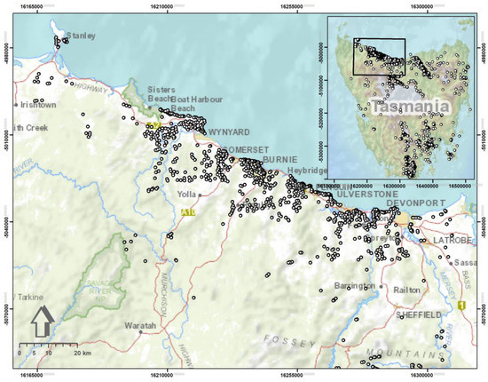 In terms of Tasmania, numerous patches of land are susceptible to slope instability, whereby the existing records since the 1950s, around 75 houses are seriously damaged by landslides, or demolished due to substantial damage. Fortunately, there is no occurred fatal incident during this time window. Nonetheless, these slope failure events are extremely disturbing to those directly affected, where the financial damage to people and/or the State runs into many millions of dollars. Yet, usually no insurance company provides cover for landslide damages, nor the Tasmanian government has paid to compensate for financial loss in the past [35]. No doubt that this type of disasters and its adverse effects can be avoided when ground conditions are deciphered and fully understood prior to the construction of properties. Although landslide events can occur anywhere across Tasmania, they have been mostly active in several areas of the Northwest landscape, the Tamar Valley, as well as specific areas in and around Hobart, Launceston, and St Helens. Here, in this research, we utilize a landslide inventory of Northwest Tasmania (Figure 1). Mineral Resources Tasmania (MRT) undertook many activities to deal with landslides such as LSM, administration of declared or proclaimed areas of slope failure and also monitoring of a small number of “problematic” landslides. The current landslide inventory that is utilized for this research is also developed by MRT (https://maps.thelist.tas.gov.au/listmap/app/list/map).