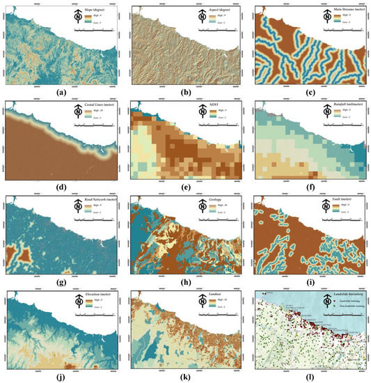 Figure 2. Eleven applied landslide-conditioning factors involving: (a) Slope; (b) aspect; (c) distance to main streams; (d) distance to coastal lines; (e) NDVI; (f) mean annual rainfall; (g) distance to roads; (h) geology; (i) distance to faults; (j) elevation; (k) land-use, and (l) landslide/non-landslide inventory database used for training the model.