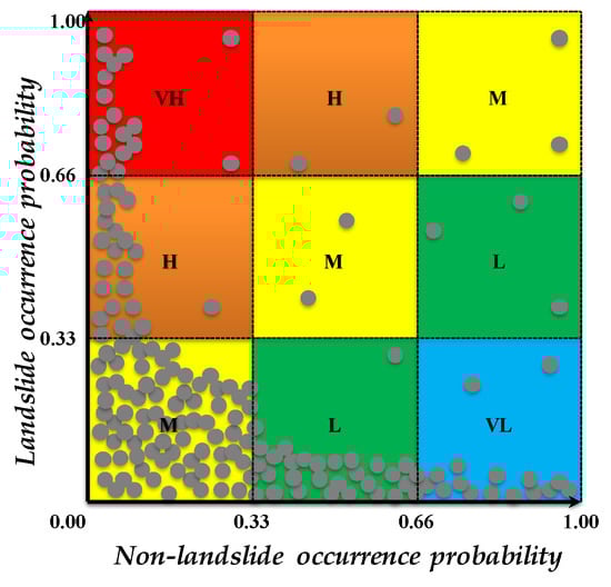As explained above, following our proposed rule-based method, every output pixel has two distinguished susceptibility “values” including landslide and non-landslide occurrence (resistance). Accordingly, the location of each pixel in the above 2D scatter plot determines the susceptibility “class” of that pixel. For instance, if the y (i.e., landslide occurrence probability) value of the scatter plot is above 0.66 while the x (i.e., non-landslide occurrence probability) value of the scatterplot is below 0.33, then the susceptibility score for that pixel is VH. Obviously, data breaks (currently 0.33 and 0.66) can be modified by users; however, the current breaks are selected to preserve equal intervals on x and y axis.