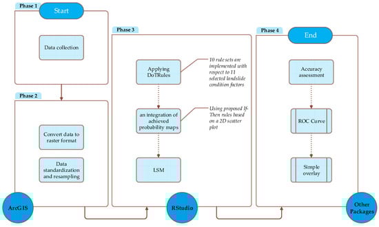 Our research methodology is implemented using the following four-phase experimental design (see Figure 4). In phase 1, we collected the required data for simulation from different resources. Considering the fact that landslide-conditioning factors from Table 1 are measured not only in different units (e.g., nominal, ordinal, etc.) but also in different scales (e.g., interval, and ratio scales, etc.) [56], there was an urgent need for data resampling and standardization. This arises from the innate need to combine all landslide criteria into the single output in the evaluation process. Therefore, in phase 2, we converted our dataset into raster format with the same spatial dimensions and then we re-classified each landslide-conditioning factor to H discrete classes, as shown in Table 1. Referring to the existing susceptibility mapping literature, there is no optimal method for choosing the most appropriate number of classes (i.e., H) for data discretization; these are generally selected according to the preferences of the DMs [11,57]. In phase 3, the proposed method is applied for susceptibility mapping, followed by an integration of achieved probability maps using proposed If-Then rules based on the proposed 2D scatter plot (Figure 3). Finally, the achieved results were mapped and the corresponding accuracy of our LSM was assessed in phase 4.