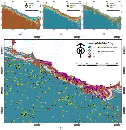 Figure 5. Achieved results of methodology implementation including (a) non-landslide occurrence probability (resistance), (b) landslide probability, (c) entropy (i.e., uncertainty) of susceptibility mapping, and (d) LSM.