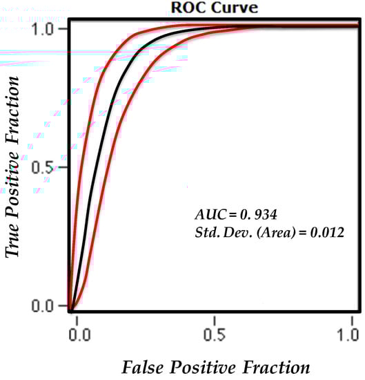 In pursuance of further implementation of the ROC evaluation technique, a precise and comprehensive test dataset was prepared using 391 landslides and 391 randomly selected non-landslide points of the study area. Subsequently, the AUC value of 0.934 was obtained with an estimated standard error of 0.012 (see Figure 6). A further detailed summary statistics of ROC analysis is demonstrated in Table 4.