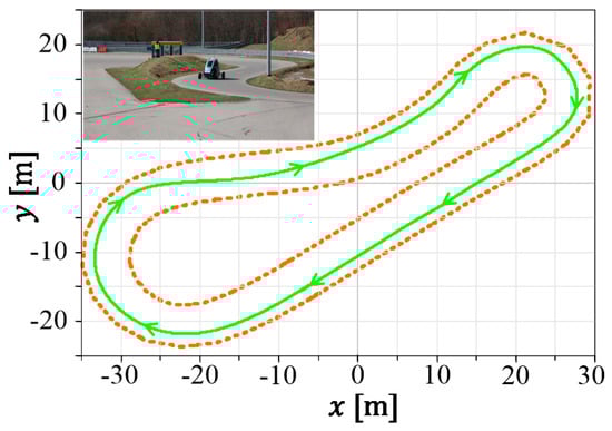For the experimental evaluation of the constrained state estimation of DLR’s ROboMObil, several test campaigns were carried out at the ADAC (General German Automobile Club) vehicle testing ground in Kempten, Germany. Here, tests of an advanced version of the interactive vehicle path following control (PFC) [2,3] have been performed. In the top left of Figure 1, a portrait of the testing track is shown. The green line depicts the preplanned vehicle path, while the road boundaries are represented by the dotted-orange lines.