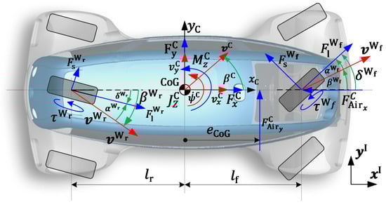 The details of the extended single track model equation derivation are given in the Appendix A. It is worth mentioning that with the Modelica modeling technology, it was easily possible to integrate “if-else” constructs, which are efficiently processed by the event handling features of the compiler, while experimenting with varying discretization methods and sample rates, as the model is in continuous-time formulation. The vehicle state vector is denoted as follows, and is graphically exemplified in Figure 3: