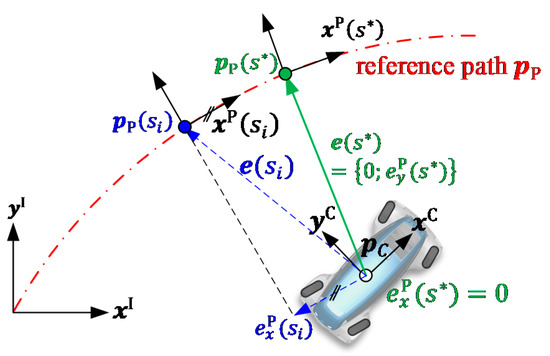 Ideally, the actual path position and the position of the car coincide, p P ( s * ) = p C (cf. Figure 4). To approximate this condition, it is necessary to minimize the displacement ( e ( s ) ) between the vehicle and reference path, as depicted in the following: