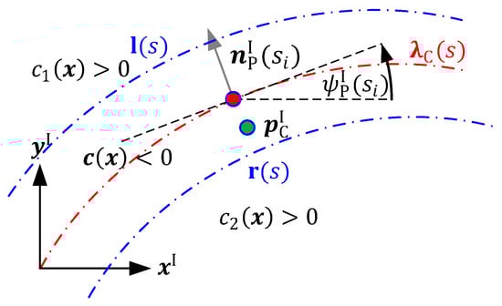 By means of the path normal vector ( n P I ( s i ) ), represented in the inertial coordinate system (Equation (2)), an inequality function c ( x ) 0 is calculated that penalizes the positions outside of the roadway borders, as follows: