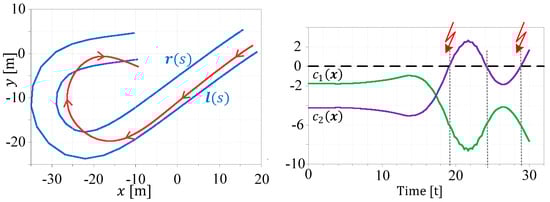 Figure 6 shows an example for the calculation of the nonlinear constraint function. In the left plot, a street is marked with the left l ( s ) and the right r ( s ) street boundaries, while the car (red line with direction arrows) crosses the right boundary in the hairpin curve. This leads to a violation of the right border constraint condition c 1 ( x ) > 0 ,     t [ 19.6   22.1 ]   [ 29.4   30 ] , as can be seen in the right plot of Figure 6.