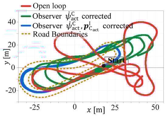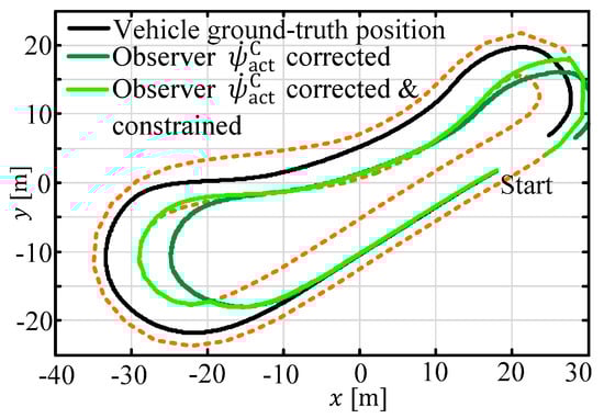Assuming that only the vehicle yaw rate ( ψ ˙ act C ) is available to the (extended) Kalman filter, the position estimate would drift away, as shown in Figure 7 dark green line). Making use of the proposed boundary estimation approach used here, in combination with the inequality handling feature from the author of [2], yields a bounded and valid result (light green line), as follows: