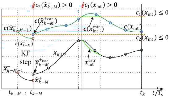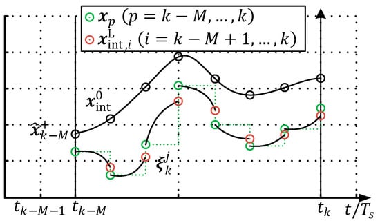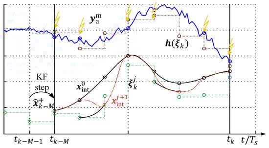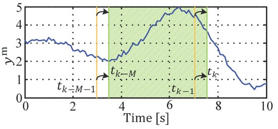 Therefore, a sliding window with M steps back from the actual time instance ( t k ), is considered to smooth the state estimation. In every sample step ( T s ), this window is shifted one-step ahead—in Figure 8 this is illustrated for one measurement variable, y m . At the filter initialization ( t 0 ), only one measurement is available, and therefore the measurement storage must be filled with r < M steps before the window starts to move. Afterwards, the window length is kept constant and all of the past M measurements are taken into account (the window with M measurements is colored in green in the subsequent figures). In other words, MHE can be seen as a real-time calculable approximation of the full-information filter.