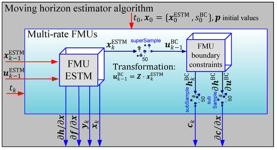 All of the system function evaluations were done by the FMI [6] (cf. also Section 3.2) and are marked in red in the following section. The optimization vector ( ξ k ) is assembled with M subsequent discrete state vectors within the current estimation window. The optimization cost function g ( ξ k ) in Equation (9) is composed of the following three parts.