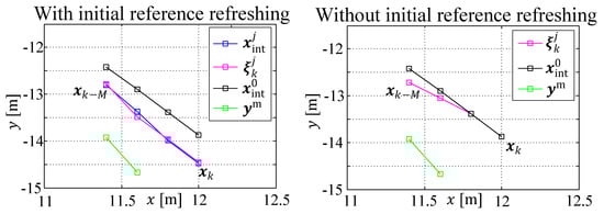 The first argument I k M + is the arrival cost, which summarizes all of the available information prior to the estimation window; this can also be seen as a regulation term on the states at t k M [21]. It is introduced so as to guarantee that the oldest estimation ( x k M ) is coincident with the corrected Kalman filter state estimation ( x ^ k M + ) weighted with the information matrix ( I k M + ). Note that in every moving horizon estimation step, a Kalman filter step from k M 1 to k M is performed to fulfill the Kalman state estimation theory—Equation (7). The information matrix, I k M + , is calculated via the inverse of the covariance matrix ( P k M + ) 1 . As direct matrix inversion should be avoided, because of the numerical stability and accuracy, the author proposes using a square root (SR)-UKF or SR-EKF Kalman filter algorithm that uses square-root decomposition and rank 1 updates to propagate the covariance matrix in a lower triangular form, P = L U . The inverse of the lower triangular ( L ) can be efficiently calculated by the LAPACK routine DTRTRI, and therefore, the propagated information matrix results in I k M + = L 1 L .