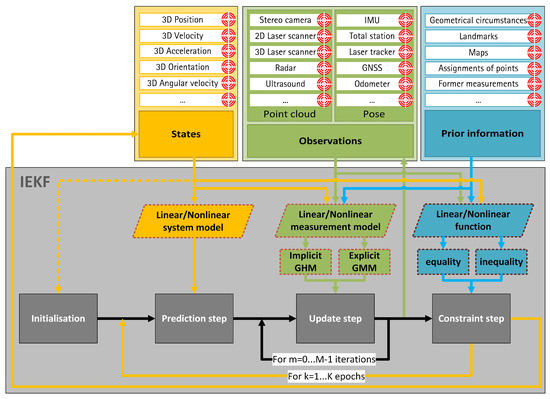 In theory, all possible input data should be considered. These input possibilities are restricted to the most common ones for the sake of simplification and according to the current paper perspectives. However, it should be noted that other types of input data are also possible and should be considered based on the application. A schematic overview of the universal recursive filter approach for georeferencing of a kinematic MSS together with corresponding relations between states, observations, prior information and respective parts of an IEKF is illustrated in Figure 1. In addition to the input data (states and observations) and prior information, sets of fundamental functions have to be formulated and integrated into the process. An arbitrary system model will describe the physical behaviour of the MSS between neighbouring epochs. Any model from the current state of the art can be selected for this. Total neglection of the system model is also possible and will result in a sequential adjustment approach. Formulation of a measurement model can happen in an implicit and/or explicit manner. (Non)linear functions regarding the states can also be added by means of equality and/or inequality formulations. Such state constraints can be integrated by means of several different methods (e.g., pseudo observations, projection method, probability density function (PDF) truncation or soft constraints). However, equality and inequality constraints have the crucial advantage of including specific further information into the filter approach by means of clear values (in the case of equalities) or thresholds (in the case of inequalities).