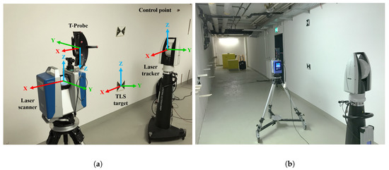 The kinematic MSS consists of a 3D TLS, a laser tracker, and a special probe (a normally hand-held combination of a reflector and ten LEDs for pose estimation regarding the laser tracker). The TLS is a Zoller + Fröhlich Imager 5016, which is used in a 2D profile mode for this application. The measuring rate of this sensor is 55 profiles/second and its range noise is 0.3 mm for a distance of 10 m [22]. The TLS is mounted on a rollable platform. On the other hand, the laser tracker used is a Leica AT960 LR with its Leica T-Probe. The T-Probe is rigidly mounted on top of the TLS and, therefore, moves with the TLS along the trajectory (cf. Figure 2a). Combination of the laser tracker with the T-probe gives the position with an accuracy of ±15 m + 6 m/m (as a maximum permissible error (MPE) for the 3D position) and the orientation with an MPE of = 18 m/100 mm for the accuracy of each orientation-direction, respectively [23]. Due to the integration of such a highly accurate laser tracker into this MSS, the reference pose information with superordinated accuracy could be derived directly.
