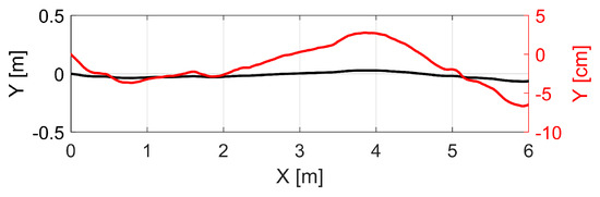 Top view of the measured trajectory obtained by the laser tracker. Two visualizations of the same trajectory in order to highlight the almost linear course. The black curve is regarding the left y-axis (meter) and the red curve regarding the right y-axis (centimetre).