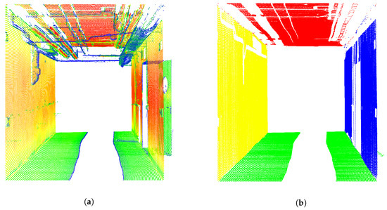 Further indispensable information were the assignments of every single 3D scan point to distinctive planes (left wall, right wall, ceiling and floor) of the environment. For this purpose, every captured LSP was segmented individually to identify the walls, ceiling and floor properly. This is done by a RANSAC algorithm in order to find suitable line segments within each single LSP. Applied distance threshold for the consensus set was 5 mm in combination with a maximum of 30 iterations. Suitable candidates have a minimum percentage (2%) of points in comparison to the total number of points within the respective LSP. Additionally, at least 20 points needed to be assigned to a line segment. In order to only identify lines, which represented left or right walls or rather ceilings or floors, only those candidates were selected which are almost parallel or perpendicular regarding the standing axis of the laser scanner (which is known by means of the local coordinate system). In order to avoid doors, leads or other obstacles, line candidates were compared regarding averaged assignments of several past LSPs (named as memory subsequently). The criteria used for this are changes in distance between the respective line and origin of the laser scanner and the variation of the averaged intensity of respective scan points. Both criteria are analyzed regarding the memory mentioned. Rough outliers in the assignment could be identified by applying such a restriction. Finally, every N single 3D scan point of the LSP within each epoch is assigned to left wall, right wall, ceiling, floor or remains as unused. These extended LSP are denoted subsequently. Thus, in total, is equal to but contains mentioned additional segmentation information for every measured scan point. The results of the assignment algorithm introduced in relation to the case study are depicted in Figure 4a,b. Interfering objects (e.g., pipes and cables) are erased.