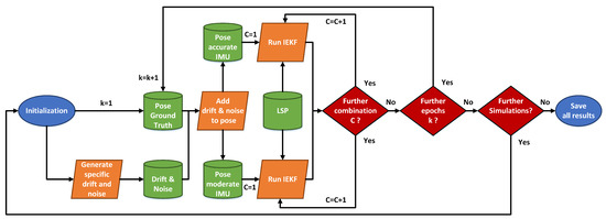 A standardized estimation approach is indispensable to ensure an accurate, precise, reliable and complete georeferencing solution of different arbitrary kinematic MSS. The drawbacks mentioned in Section 1 could be eliminated only by providing a generally valid framework, which is applicable to as many use cases and systems as possible. For this reason, a recursive state estimation approach, which is compatible with various types of input data (e.g., requested states, available sensor observations and additional prior information), is formulated in this paper. However, the basic structure and equations used are with respect to [16]. The carefully selected information depends on each individual application and its respective circumstances. However, they are combined and fused in a unified way within the general valid framework to deliver optimal results. Necessary demands on the input data can be divided into four interconnected questions: