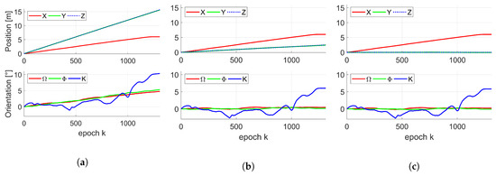 Mean change in position (top) and orientation (bottom) of the kinematic MSS by means of 500 simulated moderate IMU poses (a) and accurate IMU poses (b) over K epochs. True change in position (top) and orientation (bottom) of the kinematic MSS by means of laser tracker pose (c) over K epochs.