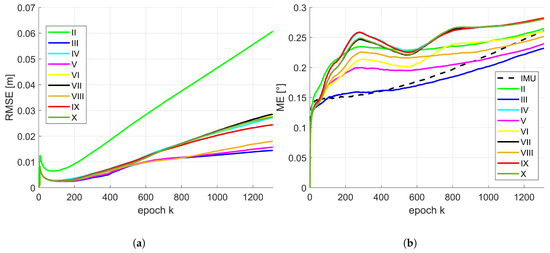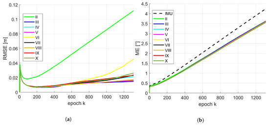Due to the conclusions provided by means of Table 4 and Table 5, the temporal progress in position and orientation of the RMSE or rather ME for different combinations of state constraints are depicted in Figure 7 for the moderate IMU. The same results regarding the accurate IMU are depicted in Figure 8. For presentation purposes, inaccurate solutions (e.g., IMU in terms of position; combination I) are omitted. The basic behaviour of the temporal progress of the RMSE for position of both IMUs was very similar. All combinations increased drastically within the very first epochs. After this running-in effect of the filter they decrease quickly and continue differently over time. Over all epochs, combination II leads to a significant larger RMSE and has the largest increase. This is of interest, except normalized plane normal vectors, no further geometrical constraints like concurrency or perpendicularity were considered within this configuration. Combination III, V and VIII are very similar and lead to the best results around 1.5 cm. Remaining combinations have a slightly larger increase and will end up between 2–5 cm. Temporal behaviour of the ME for orientation is slightly different for both IMUs. They also increased drastically within the very first epochs. Afterwards, the gradient was related to the initially drifted IMU solution. However, all presented solutions for the moderate IMU were lower than respective initial IMU solution. In addition, gradient and progress are almost identical for this type of IMU. In case of the accurate IMU, there was a slight variation between all combinations. But from epoch k = 800 the increase was for all combinations lower than the IMU solution. Combination III behaves most similar to the IMU solution in the beginning and undercut the IMU curve at epoch k = 400.