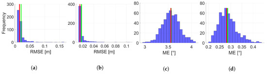 Histograms of the RMSE for position by means of 500 replications for combination III (moderate IMU (a)) and combination III (accurate IMU (b)) of state constraints applied. Related histograms of the ME for orientation by means of 500 replications for combination X (moderate IMU (c)) and combination III (accurate IMU (d)) of state constraints applied. Respective mean is given by a red bar and respective median by a green bar. The Roman numerals refer to respective state constraints applied regarding Table 3.