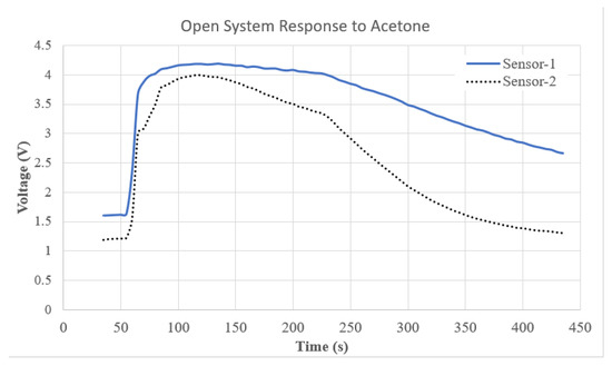 Figure 2. Responses of Sensor-1 and Sensor-2 placed in the third chamber of the system to acetone introduced in the second chamber at 0.5 L/min.