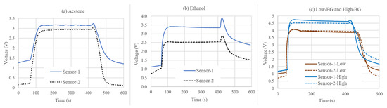 Based on the above results, a consistent flow control method was developed. The timing and flow control are shown in Table 2. Figure 3 shows the response of the two sensors in the sensor array to 1 ppm of acetone introduced using the process shown in Table 2. While we could not find an exact replica of the tests we conducted with these sensors, comparable experiments are reported in [30,31]. In the published work, the sensors are tested with 1 ppm of acetone and the results are comparable to the sensor responses shown in Figure 3. The sensor responses shown in Figure 3 were divided into five segments, as shown in Table 3, based on the timing of sensor responses to the introduction and evacuation of the VOCs.