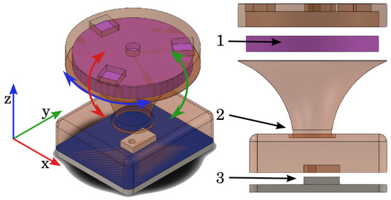 Alves de Oliveira et al. [30] developed a bio-inspired multimodal sensor module observing the functionality and placement of mechanoreceptors in the human skin. Figure 1 presents the sensing module organization where a compliant cone-like structure (2) supports a magnetic, angular rate, and gravity (MARG) system (1) and guides forces acting on the module’s surface to the pressure sensor localized on the bottom of the structure. In addition to force, the inertial measurement provides information about the deformation of the artificial skin when pressure is applied.